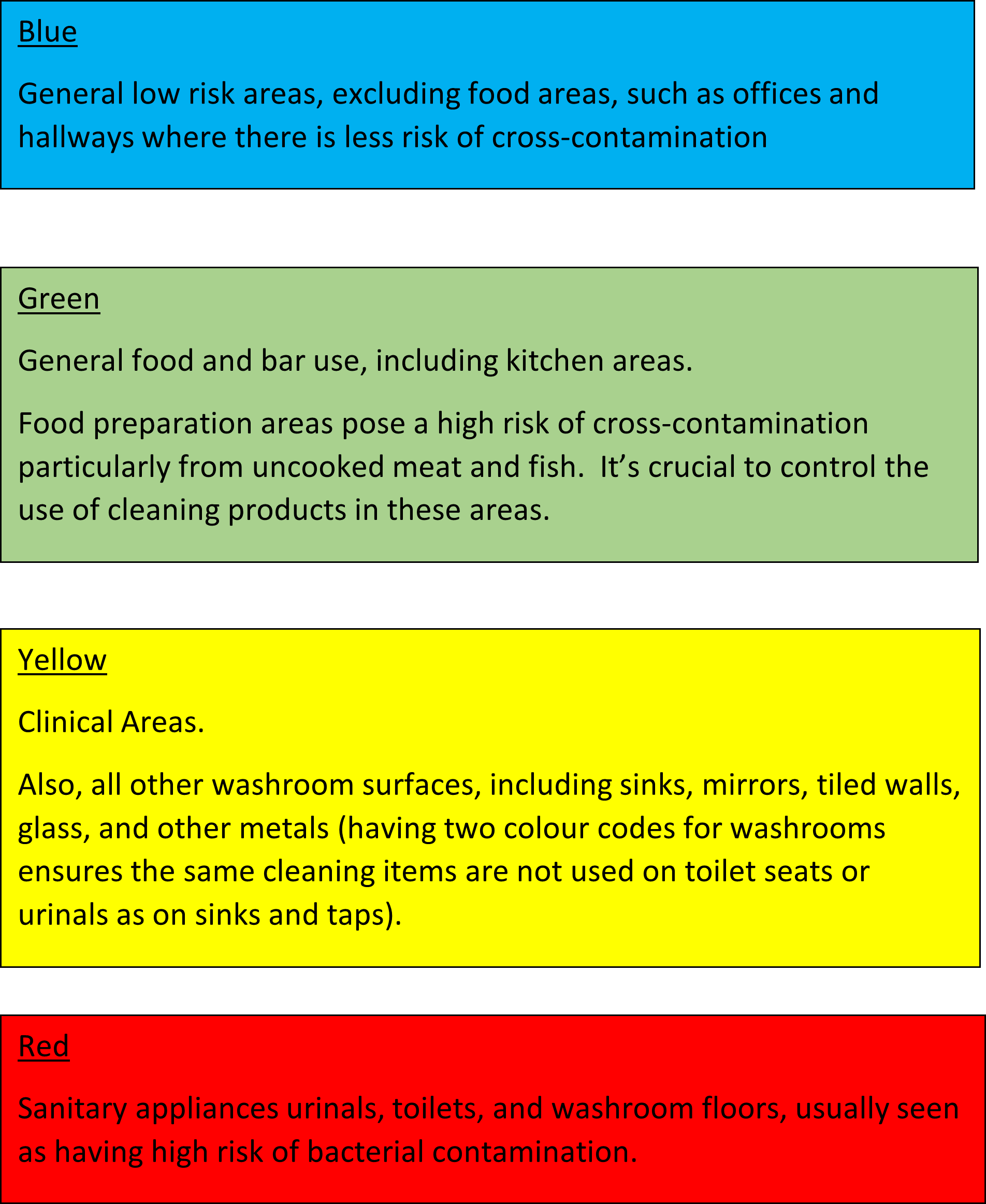 Apply a colour coded system to set apart sensitive areas from one-another. This is a tried and tested efficient way to reduce the risk of cross contamination. For example, if you are using a single mop to clean every floor in a restaurant, you might risk spreading bacteria from the washrooms and toilets to food preparation areas. The universal colour code chart developed by the BICSc is widely used within the cleaning industry.